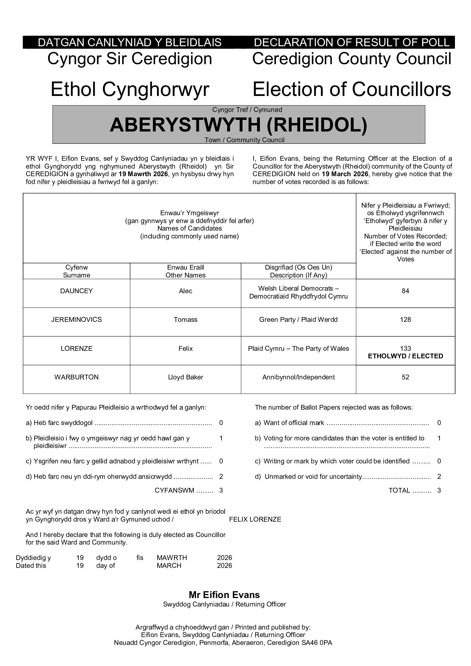 CEREDIGION a gynhaliwyd ar 19 Mawrth 2026, yn hysbysu drwy hyn